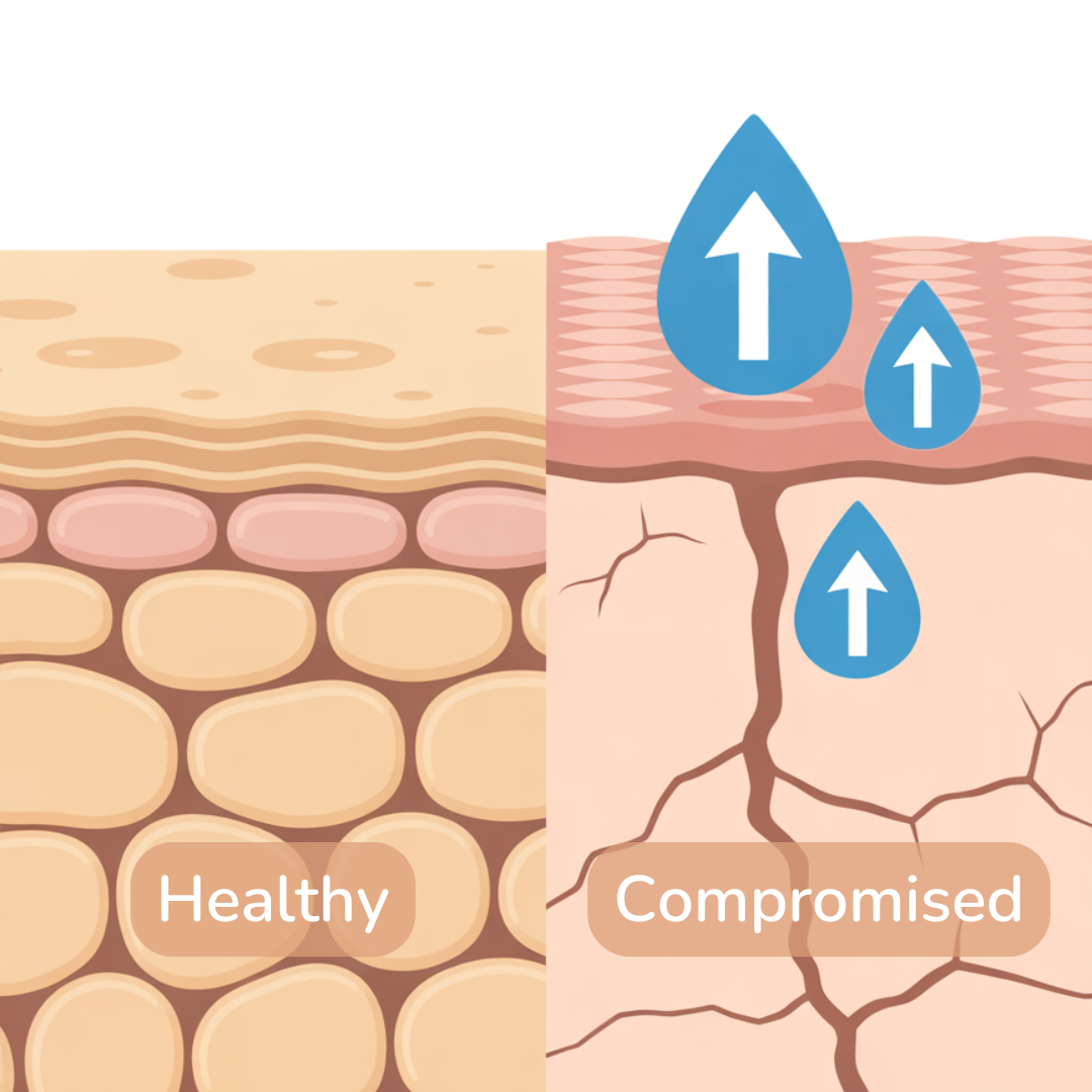 Very dry skin often lacks the natural oils needed to hold hydration in. Water escapes through the skin barrier –— a process called TEWL (transepidermal water loss).